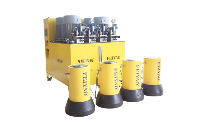 PLC多點同步頂升液壓系統(tǒng)分為5個部分:液壓泵站、PLC計算機控制系統(tǒng)、液壓系統(tǒng)、位移壓力檢測與人機界面操作系統(tǒng)。該系統(tǒng)是將液壓頂升系統(tǒng)、計算機PLC信號處理、位移監(jiān)控與橋梁結(jié)構(gòu)分析和施工技術(shù)進行集成,并在集成系統(tǒng)上進行的成套技術(shù)開發(fā)。其核心是在橋梁結(jié)構(gòu)分析與施工技術(shù)總結(jié)的基礎(chǔ)上,根據(jù)橋梁特性設(shè)計計算機PLC信號處理與液壓系統(tǒng),輸入外部監(jiān)控設(shè)施的位移信號,輸出液壓系統(tǒng)油量控制信號,利用終端多組千斤頂來達到平衡、安全與高效的橋梁頂升的目的,其頂升和降落精度誤差不超過±0.5mm,頂升載荷包括:50噸-1000噸,頂升高度為10mm到500mm。