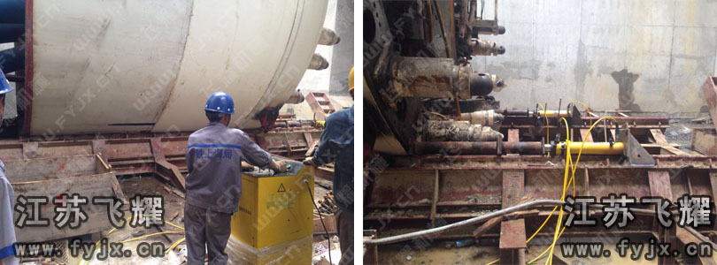 本次盾構機組裝使用江蘇飛耀的多臺雙作用液壓千斤頂以及一臺同步電動液壓泵站。主要工作是將盾構機的機頭和控制器相連。因盾構機機身龐大,有100米之長,采用分段下井法,講其一段一段下放至井底的鐵軌,并按照順序使用兩臺雙作用液壓千斤頂將其逐個推進涵洞,并在洞內(nèi)進行組裝。本次工程要求單次頂推行程稍大,保持整個過程平穩(wěn)頂推。作為國內(nèi)液壓工具龍頭企業(yè),我們很成熟的方案。施工時,飛耀工程人員也抵達現(xiàn)場對現(xiàn)場施工人員進行指導培訓,使整個工程順利的展開。